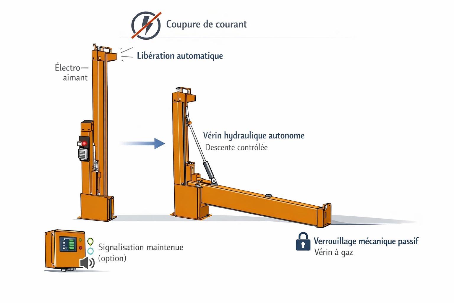 La descente s’effectue alors de manière progressive, contrôlée et sécurisée grâce à un vérin hydraulique à huile autonome, avec réglage direct de la vitesse sur le vérin.