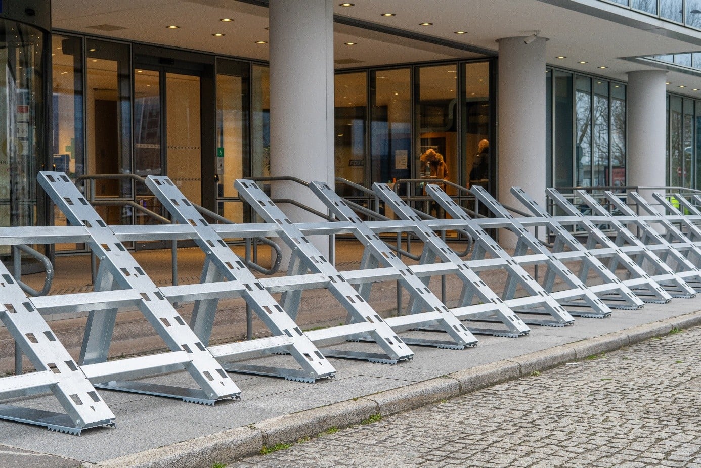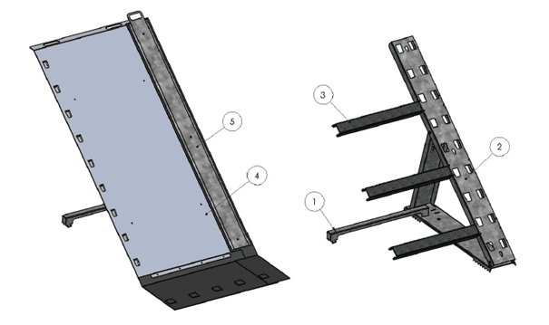 La structure est constituée de jambes de force (2), entre lesquelles viennent s’insérer des raidisseurs (3) ainsi qu’une barre d’espacement au sol (1).