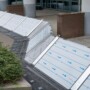 L’étanchéité entre chaque jambe de force est assurée par la mise en place de panneaux (4). L’étanchéité entre les panneaux est réalisée à l’aide de plats d’étanchéité (5). Enfin, l’étanchéité entre l’équipement et le sol est garantie par une jupe en EPDM intégrée à chaque panneau (4) et à chaque plat d’étanchéité (5).